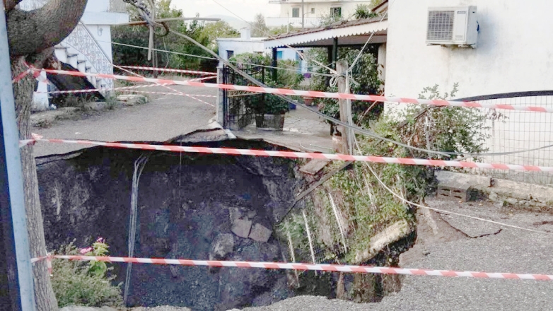 Με το πρώτο φως της ημέρας φάνηκε το μέγεθος μιας επικίνδυνης καθίζησης του εδάφους, που δημιούργησε ένα μεγάλο κρατήρα, με έκταση αρκετά μέτρα, δίπλα ακριβώς από κατοικίες.
