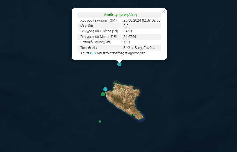Η πρώτη σεισμική δόνηση μεγέθους 3.3 βαθμών της κλίμακας Ρίχτερ σημειώθηκε στις 5:37 τα ξημερώματα, στα 8 χλμ. βόρεια της Γαύδου με εστιακό βάθος στα 10 χλμ.