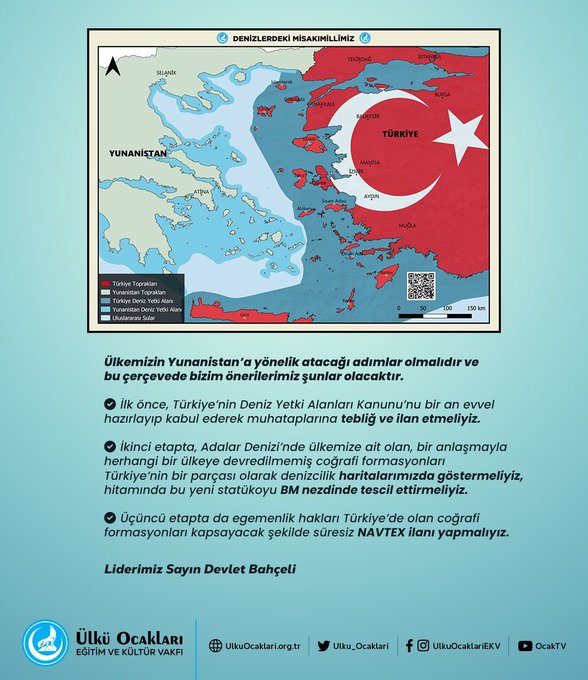 Όπως επισημαίνουν, ο χάρτης ονομάζεται «Τα εθνικά μας σύνορα στη Θάλασσα» και μάλιστα περιλαμβάνει QR code με την ομιλία του Ντεβλέτ Μπαχτσελί για το θέμα της «Γαλάζιας Πατρίδας» και του Αιγαίου.