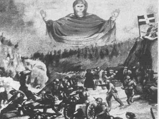 Εἶναι ἀκόμη μεσάνυχτα. Ἡ φάλαγγα ἔχει προσπεράσει πεντακόσια πενήντα μέτρα τὸν ναό, ὅταν ξαφνικὰ τὸ πρῶτο τὰνκ ἀκινητοποιεῖται στὴ μέση του δρόμου. Μπροστὰ τοὺς οἱ Γερμανοὶ βλέπουν μία μεγαλόπρεπη γυναίκα μὲ τὸ χέρι ὑψωμένο σὲ ἀπαγορευτικὴ στάση. Τὸ δεύτερο τὰνκ προσπαθεῖ νὰ προσπεράσει τὸ πρῶτο, ἀλλὰ πέφτει σ᾿ ἕνα χαντάκι, ἐνῶ τὸ τρίτο τὰνκ ἀκινητοποιεῖται σ᾿ ἕνα χωράφι, μέσα ἀπὸ τὸ ὁποῖο προσπαθοῦσε νὰ περάσει.