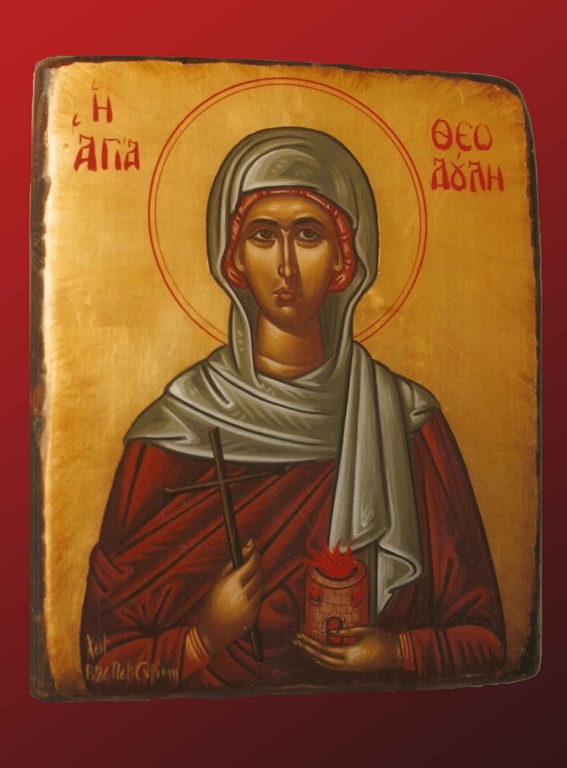 Η Αγία Θεοδούλη έζησε στα χρόνια του Διοκλητιανού (284-305 μ.Χ.) και ήταν από τη Διοκαισάρεια της Κιλικίας. Στη βία του έπαρχου Πελάγιου ν’ αρνηθεί τον Χριστό αντέτασσε, ότι είναι και θα μείνει χριστιανή. Ο Πελάγιος τότε την υπέβαλε σε μαρτύρια, από τα όποια όμως, η γυναικεία φύση της, στάθηκε ανώτερη με τη δύναμη της θείας χάρης. Και τέτοια υπήρξε η εντύπωση της σεμνότατης και ηρωϊκής διαγωγής της, ώστε και οι άνθρωποι του έπαρχου, που ήταν πριν μεταξύ των βασανιστών της, του δήλωσαν ότι παραδέχονται σα Θεό τους τον Ιησού Χριστό. Την έριξε λοιπόν, μαζί με τον Εύάγριο και τον Μακάριο στό καμίνι. Δύο άλλοι, ο Ελλάδιος και ο Βοηθός, αποκεφαλίστηκαν. Και έτσι ο περίλαμπρος ουρανός των μαρτύρων του Χριστού, στολίστηκε και με τους νέους αυτούς εξαίσιους αστέρες.