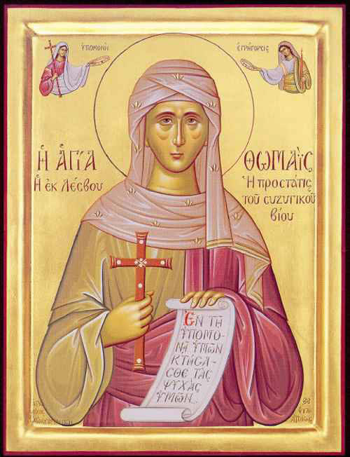 Η Αγία Θωμαΐς γεννήθηκε στη Λέσβο μεταξύ των ετών 910 – 913 μ.Χ. Οι γονείς της, Μιχαήλ και Καλή, ήταν ευσεβέστατοι, έντιμοι και ευκατάστατοι.
