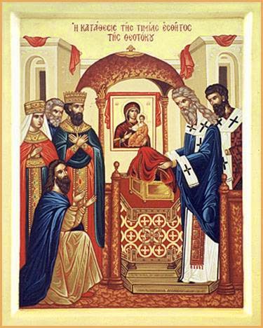 Στο Ιερό Ναό των Βλαχερνών, που είχε κτίσει η Βασίλισσα Πουλχερία, κόρη του Αυτοκράτορα Αρκαδίου και σύζυγος του Αυτοκράτορα Μαρκιανού (451 – 457 μ.Χ.), είχαν κατατεθεί τα σπάργανα (εντάφια) της Θεοτόκου, τα όποια είχαν σταλεί από τον Πατριάρχη Ιεροσολύμων Ιουβενάλιο (βλέπε ίδια ημέρα).