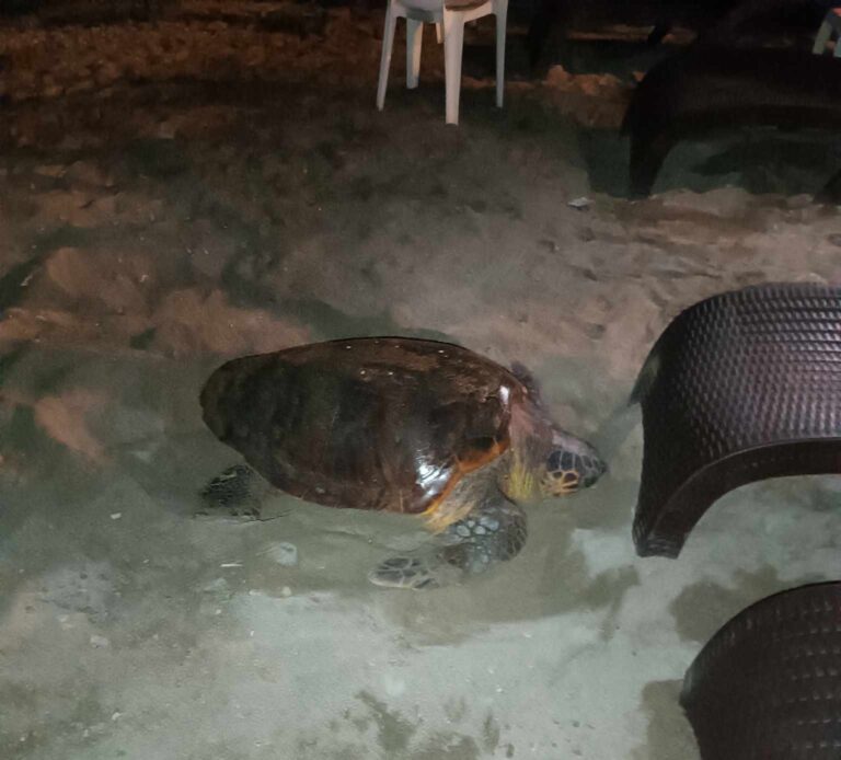 Η χελώνα αφού βγήκε από τη θάλασσα στην παραλία, γέννησε τα αυγά της και τα σκέπασε δίπλα σε ξαπλώστρα καταστήματος εστίασης, ενώ όσοι την αντιλήφθηκαν έσπευσαν να βάλουν μερικά ξύλα και να “οριοθετήσουν” τη φωλιά της ώστε να μη κινδυνέψουν τα αυγά της.