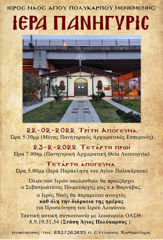 Στις 22 και 23 Φεβρουαρίου ο Ιερός Ναός Αγίου Πολυκάρπου Μενεμένης, εορτάζει την μνήμη του Αγίου.