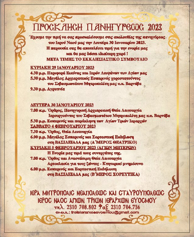 Ιερά Πανήγυρις Ιερού Ναού Αγίων Τριών Ιεραρχών Ευόσμου ΕΛΛΑΔΑ ΘΕΣΣΑΛΟΝΙΚΗ ΘΡΗΣΚΕΥΤΙΚΑ 28 Ιανουαρίου 2023ΔΗΜΟΣΙΟΓΡΑΦΙΚΗ ΟΜΑΔΑ Την μνήμη των Τριών Ιεραρχών θα εορτάσει ο αφιερωμένος σε αυτούς Ιερός Ναός στον Εύοσμο Θεσσαλονίκης. Ακολουθούν η πρόσκληση στην Ιερά Πανήγυρη καθώς και το λατρευτικό πρόγραμμα. Κοινοποίησε το