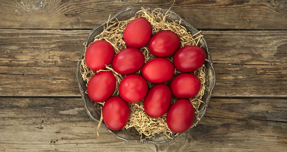 Τα κόκκινα σαν αίμα αυγά, για να τιμήσουν το αίμα του Ιησού Χριστού, ανταλλάσσονται στην Ελλάδα. Μόνο όσοι πενθούν από πρόσφατο θάνατο οικείου προσώπου δε βάφουν αβγά για το Πάσχα. Αλλά και σε αυτούς θα φέρουν οι συγγενείς και οι φίλοι βαμμένα αβγά και από αυτά θα αφήσουν και στον τάφο του αγαπημένου τους.