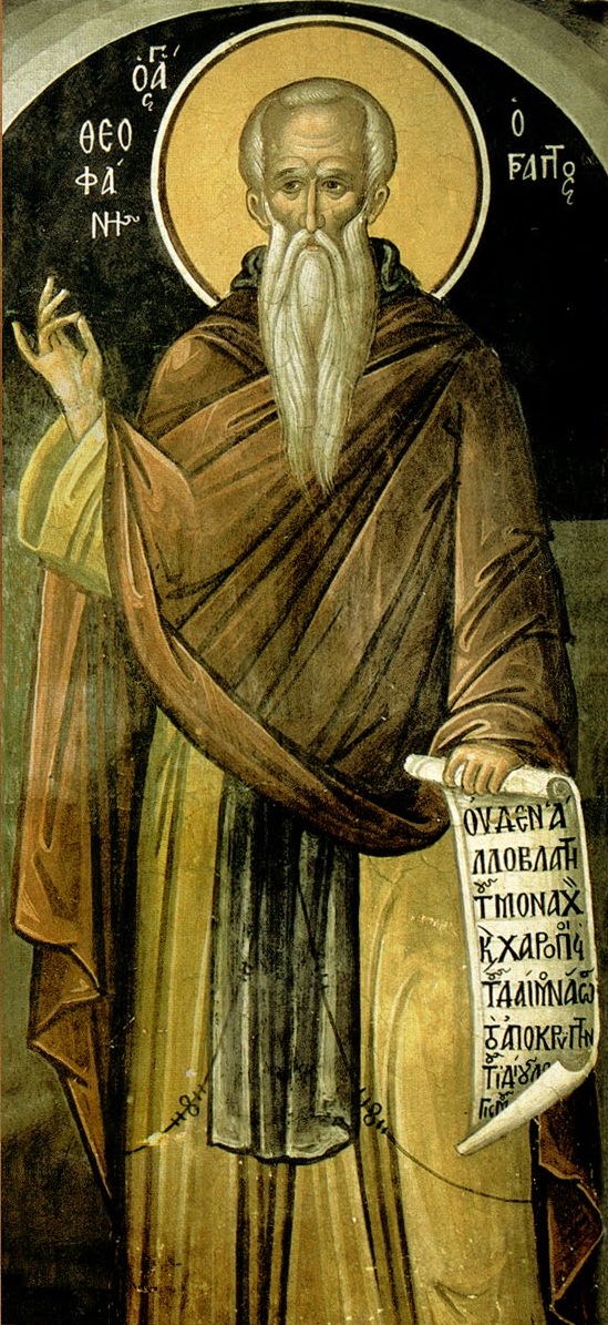 Ο Όσιος Θεοφάνης ήταν αδελφός του Θεοδώρου του Γραπτού (βλέπε 27 Δεκεμβρίου) και διακρινόταν για τη μάθηση των αγίων γραφών και της Ιερής θεολογίας, αλλά και για την ακριβή γνώση των αρχαίων Ελληνικών συγγραφών.