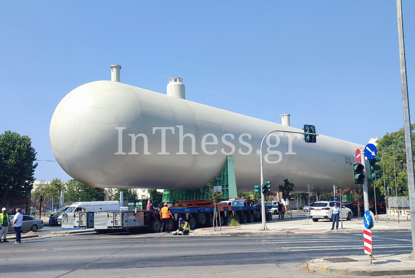 Την μεταφορά της έχει αναλάβει εργολαβική εταιρεία με την επωνυμία ΕΚΜΕ, η οποία για την “ασφαλή διέλευση” της δεξαμενής ξηλώνει καθε εμπόδιο οπως φωτεινούς σηματοδότες.