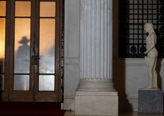 Η φωτογραφία τη δείχνει μόνο ως σκιά πίσω από μια κλειστή πόρτα στο Μαξίμου με το καπέλο που φορά να επιβεβαιώνει την ταυτότητά της.