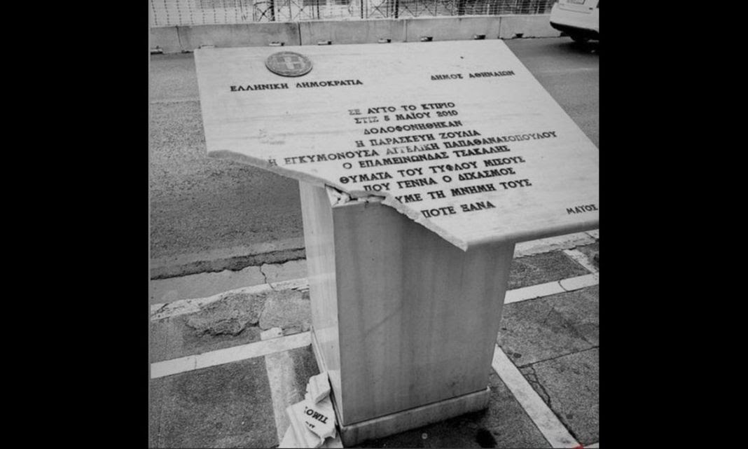 Άγνωστοι βανδάλισαν την αφιερωματική μαρμάρινη πλάκα για τα θύματα της τραγωδίας της Marfin που έλαβε χώρα στις 5 Μαΐου του 2010.